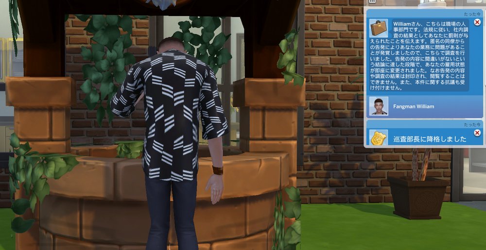 さて、みなさんはこの男を覚えていらっしゃるでしょうか? そう、捜査官キャリアが昇進できずにやさぐれていたウィリアム・ファングマンです プレイヤーの執念の「祈り」が井戸にも届いたのでしょう とうとうキャリアトップの「警察本部長」に登り詰めることができました 記念撮影です 新本部長はコウモリ形態で署内を移動します ウィリアム・ファングマン「ひとつの署にふたりも『本部長』はいらんわい」 市民から調書をとるのも大事な仕事です コリウスさん、ウィリアムのことを「この辺りで一番の捜査官」と呼ぶのは嫌みにしかとれません